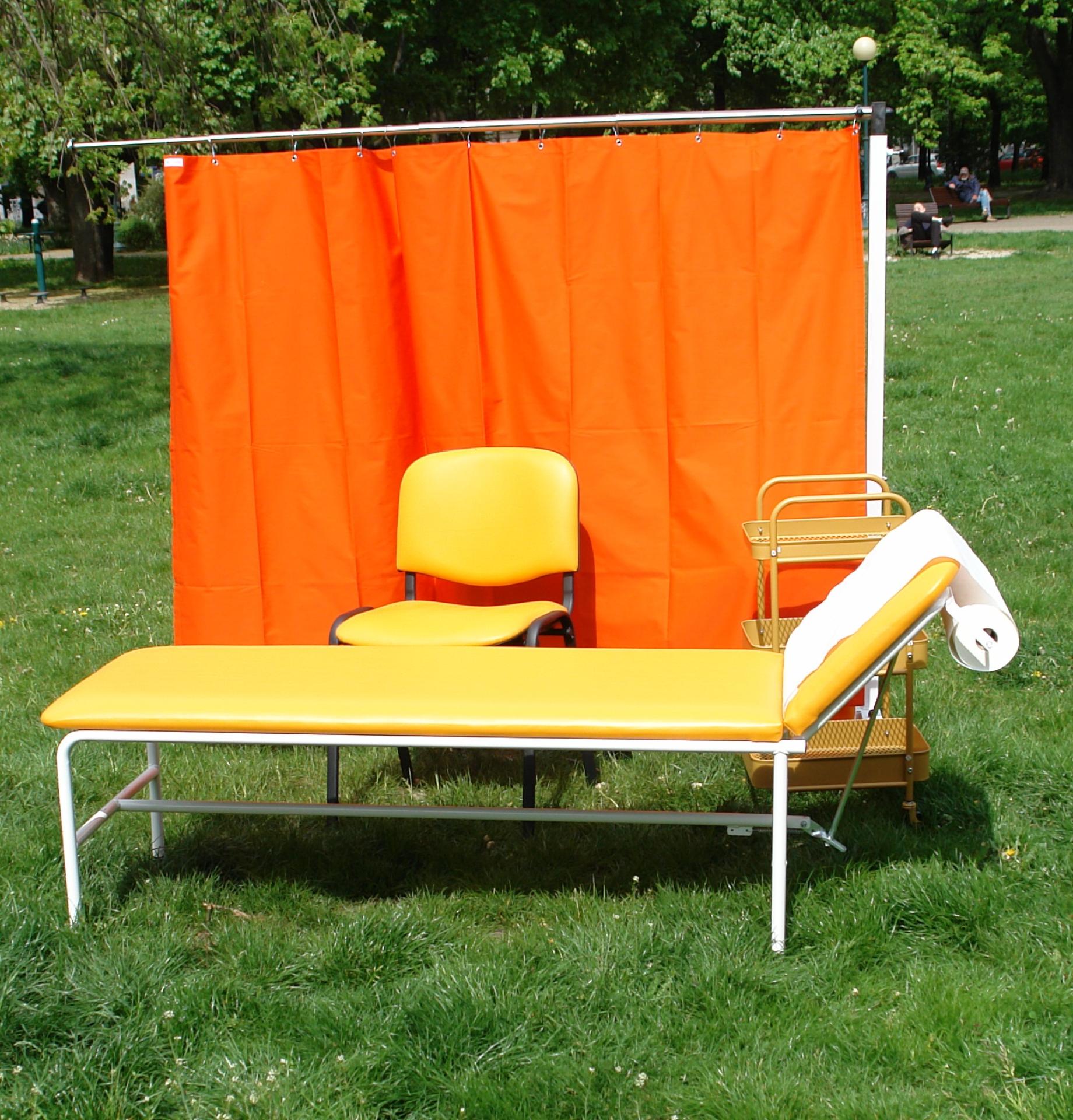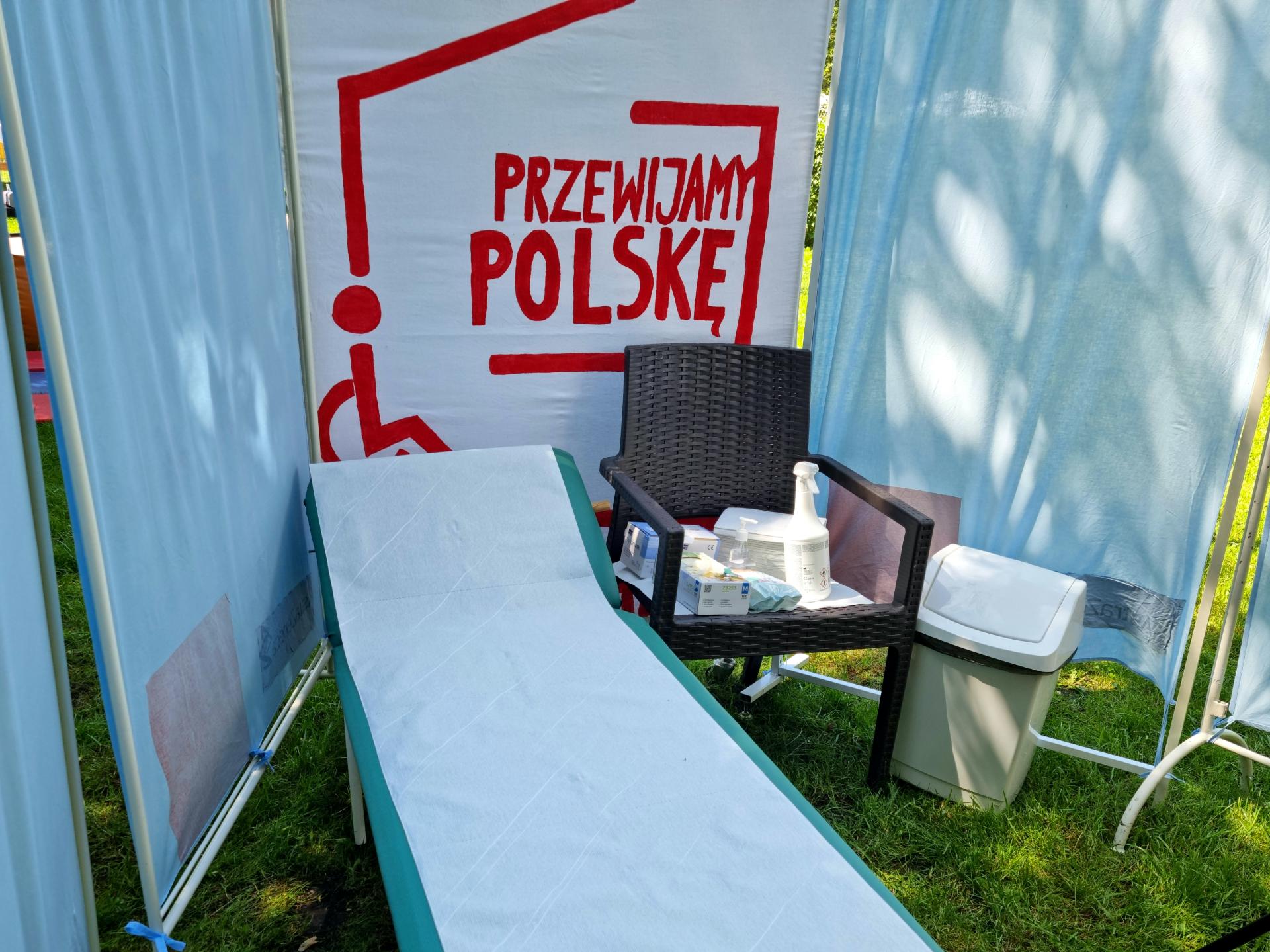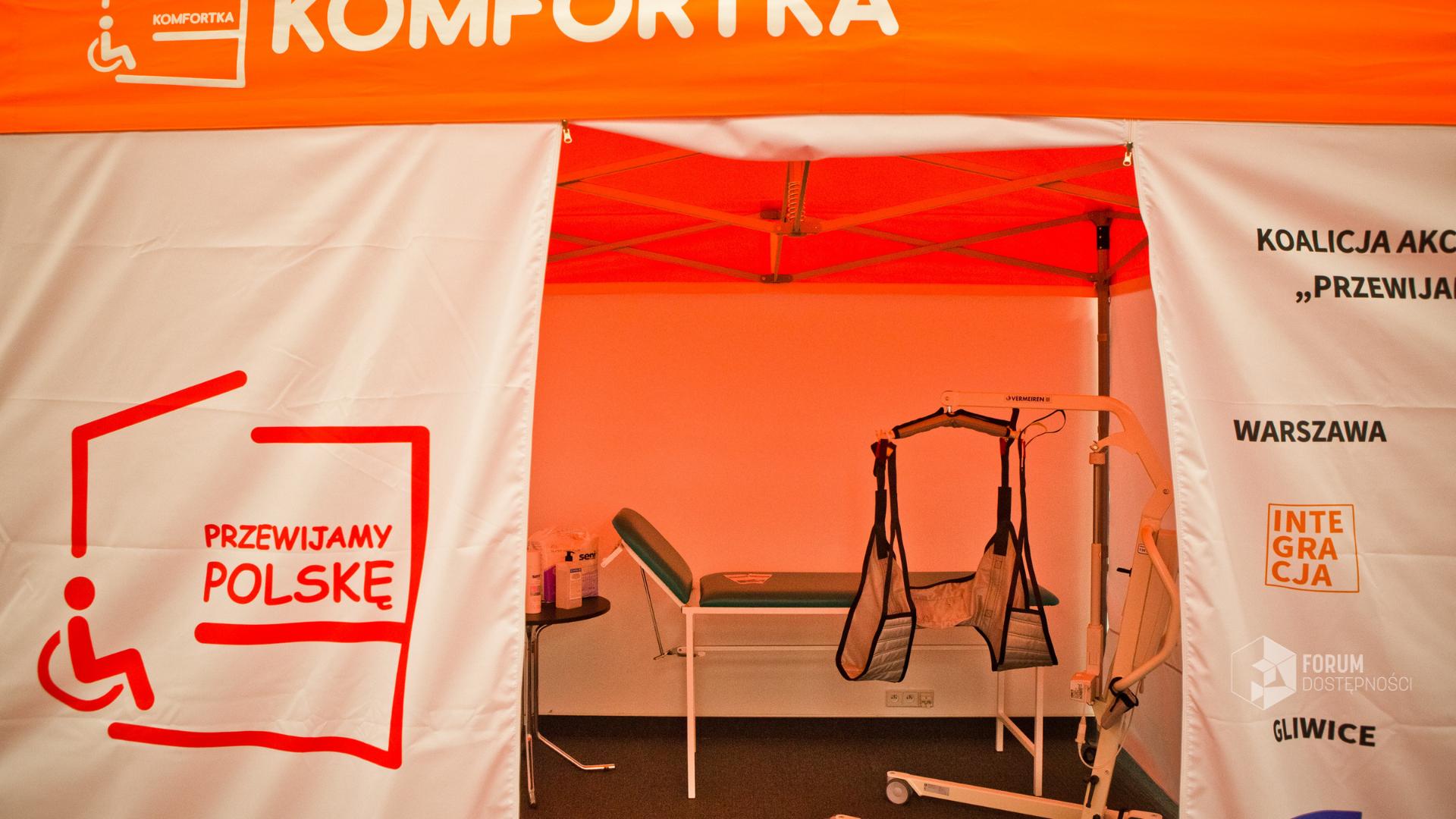 KOMFORTKA plenerowa jest to namiot z 4 ściankami, wewnątrz którego znajduje się leżanka, podnośnik (opcjonalnie), krzesło, kosz na odpady, ogrodowa umywalka i materiały sanitarno-higieniczne